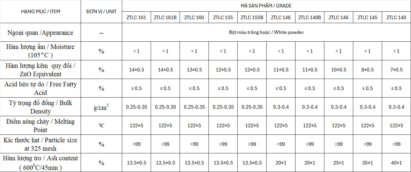 ZTLC ( 145,148,155,160,161 ): Được sản xuất thông qua quy trình tổng hợp cải tiến sử dụng axit stearic chất lượng cao và thể hiện các đặc tính sau: Khả năng bôi trơn, phân tán tốt, khả năng chống thấm nước tuyệt vời, độ trong suốt và ổn định thời tiết tốt, không độc hại, không nhuộm màu sunfua, ít hình thành màu ban đầu